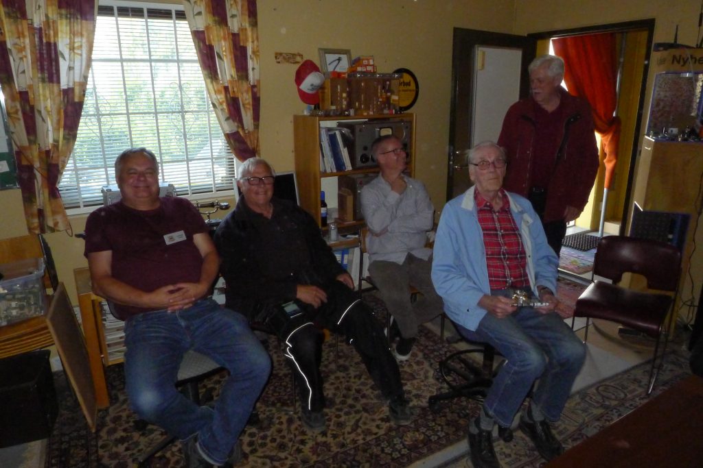 Från vänster ser vi SA7BGN/Joakim, SM7VCF/Johan, SM7GUY/Ingvar, SM7DLK/Göran och SM7BCX/Yngve, alla i glatt samspråk om amatörradions framtid och tekniska projekt.